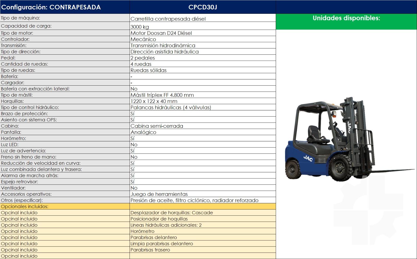 2025 JAC 3.0 Ton, Nueva, Diesel, Mástil Triplex Libre Elevación, Posicionador. Motor Hyundai. CE Disponible. Garantía de 1 año del fabricante